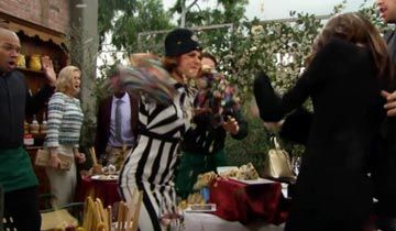 Later, Nicole was outside with Maya, dressed in the purple gown with a black shawl. They strode down the catwalks to the curb beneath the red Forrester sign, and Nicole was amazed when Zende appeared in a suit and a top hat in the back of an open horse-drawn carriage. Maya, Rick, and R.J. excitedly watched as Zende exited the carriage and presented Nicole with a rose.