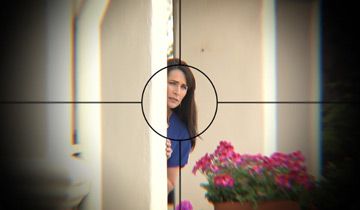 Baker took Ridge aside to talk. Quinn crept out to her terrace doors. As she barely peeped her head through the doorway to look around, either the rifle scope or the telescope with the crosshairs on the lens zoomed on her face.