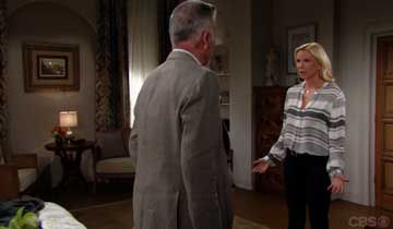 In the guest room at the mansion, Brooke demanded to know the truth about Sheila's status and if Sheila was trying to manipulate everyone so she could stay at the mansion. James wouldn't give Brooke the answer she wanted to hear, but he figured he could tell her the same thing he'd told Eric. James thought it was best if Sheila recovered there for a few days, and he asked Brooke to imagine Eric's guilt if Sheila left and collapsed somewhere else.
