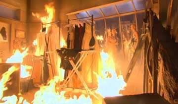 Back at Spectra, the wall plug sparked into a fire, and the flames shot up the walls. Fire engulfed the desk, the pictures, and the racks of gowns. Glass broke, and the flames stretched higher.
