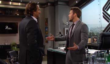 Liam said he needed to know he could trust Justin, who was the only link Bill had to get into Spencer. Justin claimed to be loyal to the company and his paycheck. Liam said Justin had to convince Liam of it, or Justin had to go. Liam was worried about his father seeking revenge on him for the failed marriage with Brooke. Liam had to know Justin would speak up if he learned of anything Bill could be up to. Justin asked if Liam thought Justin wouldn't speak up.