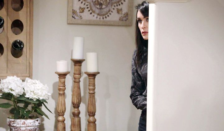 Just then, Quinn rounded the corner to enter the room. She stopped short and hung back behind a wall to listen. Donna said she'd always thought the same thing about herself and Eric as she did about Brooke and Ridge. Eric replied that he and Donna had had good years. Donna called them the best in her life, and Quinn scowled.