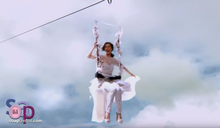 The family looked around for Steffy. Thomas spotted his sister in the air. Steffy was on a Zipline trapeze-like swing, gliding over the opera stairs toward the courtyard. She wore a lace bodysuit with a train hooked around her waist. She landed at the end of the aisle, where Ridge greeted her. The amazed guests cheered, and Sally sneaked in a selfie with Ridge and Steffy walking down the aisle behind Sally.