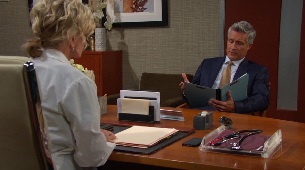 In Kayla’s office at the hospital, Kayla ended a call with Kimberly in which she reassured her sister about Bo. A man entered the office whom Kayla referred to as Jeffrey. Kayla confirmed that she had wanted to see the man urgently. Jeffrey took a seat and immediately assumed Kayla had wanted to talk about slashing his research budget. Kayla clarified that she wanted to discuss the doctor’s groundbreaking drug, Versavix; it could be her brother’s only hope.