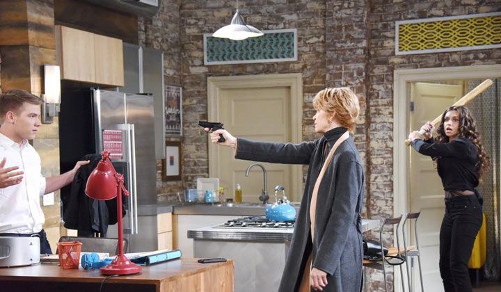 After ending the phone call, Ciara crept into the living room with a bat. Pam spotted her. With both Tripp and Ciara at gunpoint, Pam escorted them out of the loft and over to the park. Pam called John and ordered him to meet her alone in the square.