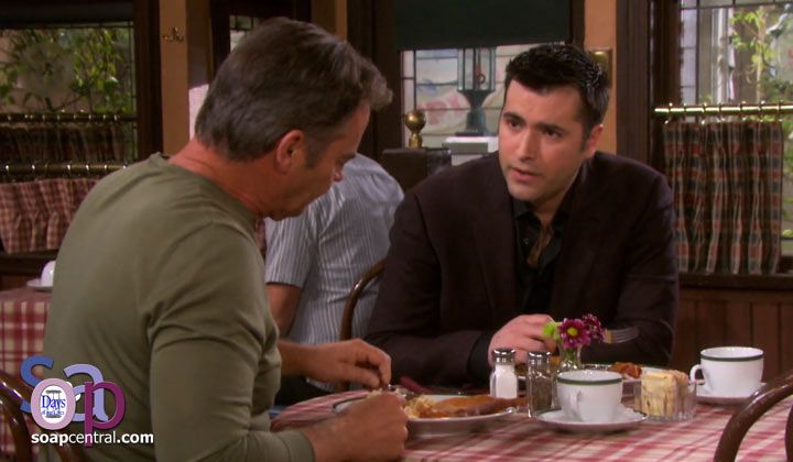 At the Brady Pub, Sonny treated Justin to breakfast as a way of trying to make up for the previous night, when Sonny and Will had failed to observe the time-honored tradition of taking the groom out for drinks on the eve of the wedding ceremony. "You two seemed a little...upset...when I [saw you last night...and] I heard you guys talking about Allie..." Justin recalled. "Eh, we didn't want to get into it [then] -- we wanted you to get a good night's sleep -- [and] I don't want to talk about it [now, either, because] the focus should be on you today," Sonny replied.