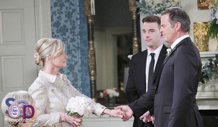 "After what Justin has been through, he deserves this happiness. And Kayla deserves it, too, after what Steve Johnson put her through," Victor said. Will announced that he needed to prepare for the ceremony, and Victor noted that the bride and groom had six weddings under their belts already. "The important thing is to do [the ceremony] fast so that we can all start drinking," Victor joked.