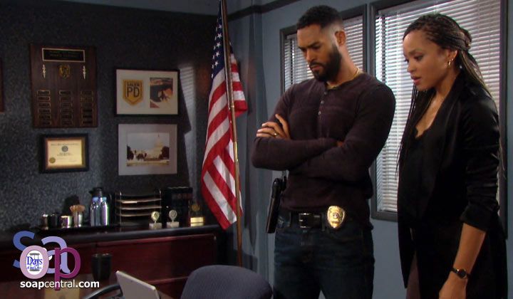 At the police station, Brady spotted Trask and called out a greeting. "Ugh... You can't see Ms. DiMera right now," Trask preemptively insisted, unable to think of any other reason for Brady to initiate a conversation. "She's in [one of the conference rooms] with your sister, conferring about the arraignment this afternoon," Trask explained. "I know," Brady replied.