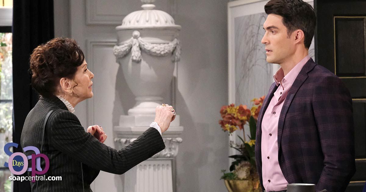 In the Kiriakis living room, Maggie was seated at the desk when Vivian returned home. "Have it your way. I'll just call the sheriff," Vivian said. "Don't bother," Maggie said. Julie told Maggie that she would wait in the car, and she wheeled Maggie's suitcase over Vivian's feet and out of the house. "I see you've come to your senses," Vivian said. Vivian noted that Maggie was not suited to be the matriarch of the Kiriakis family.