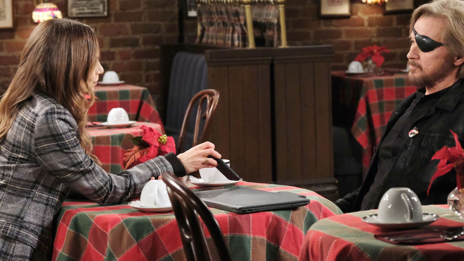 While Kayla is on hospital duty for Christmas, Steve (Stephen Nichols) spends his time at a table in the Brady Pub, which apparently is open and busy on the holiday. Steve is surprised when Ava (Tamara Braun) drops by his table with a problem.