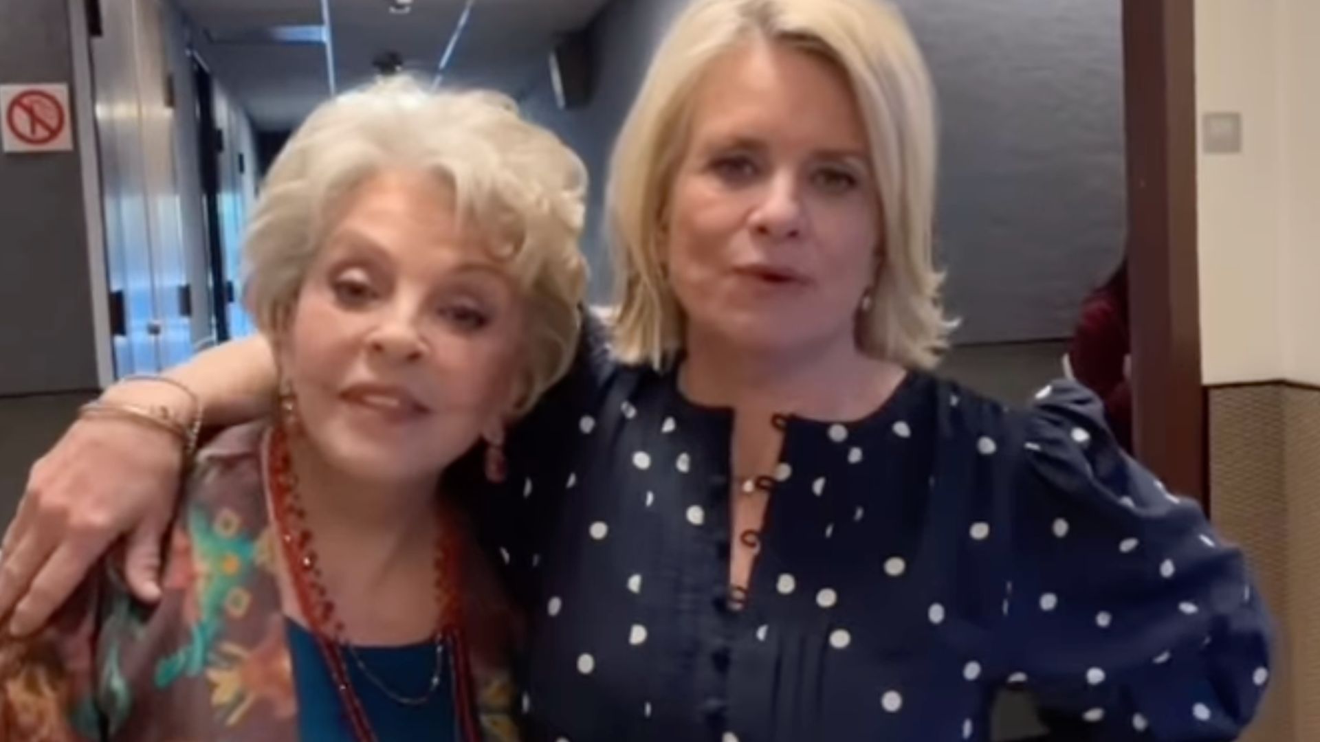In the video, as they walk through the DAYS halls, they run into Susan Seaforth Hayes (Julie Williams) in costume as Julie. The actors are thrilled to see each other again after two weeks away from the set. As Evans and Seaforth Hayes conversed about plants and flowers in their home, they smiled for the camera and declared, "Blondes United." They then invite Nichols into the shot to include "the male blonde," as Seaforth Hayes put it.