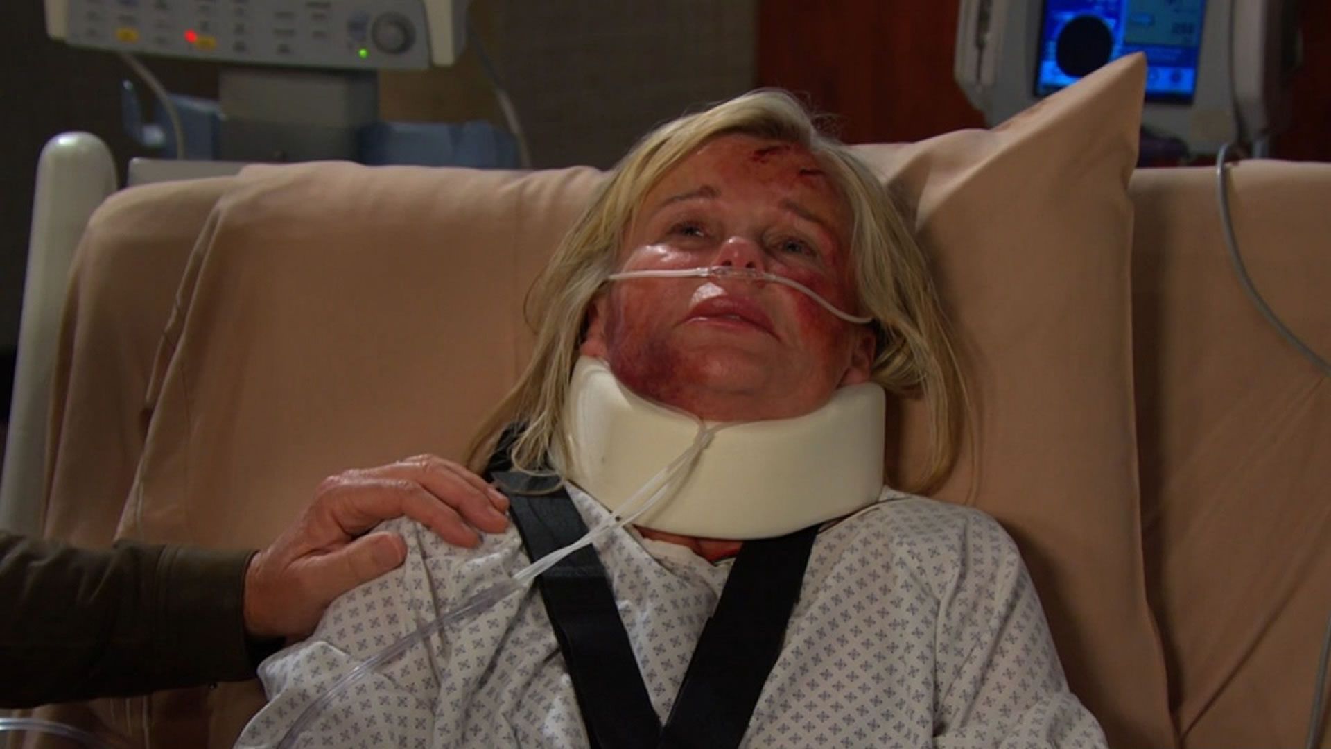 Getting back to Bonnie, major props should be given to Judi Evans. Poor Bonnie’s laid up in traction, and her face is all bruised and purple, with her jaw having been also damaged in the fall. Upon first seeing her laid up was not funny, by the way. She looked terrible! But despite her jaw issue, she continued to talk without moving her lips! Some of it was a tad unintelligible, but for the most part, she did a great job and could be hilariously understood! It reminded me of an iCarly episode where they gave an award to someone who could sing without moving their mouth. In fact, I had coincidentally just seen it the night before I watched this DAYS episode!