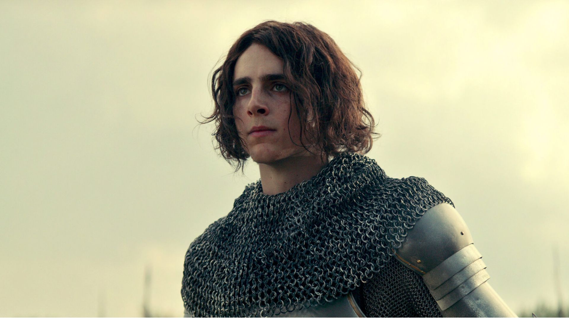 In The King, Chalamet plays Henry V, the Crown Prince of England. There are moments in this character where he tries to establish himself as a ruler, but in doing so, his eye language, makeup, and body language reveal the ambiguity and discomfort of his rule.