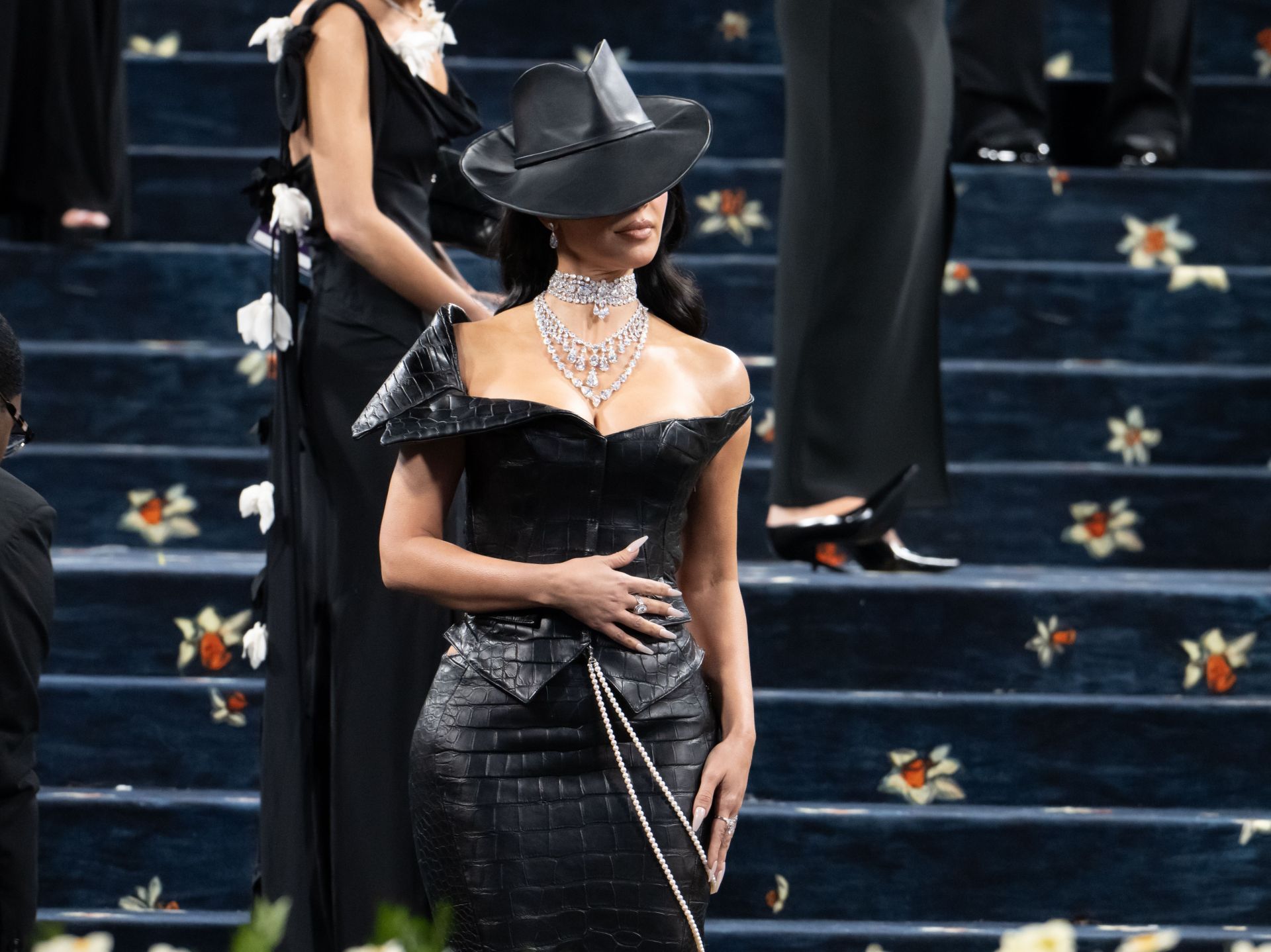 Kim Kardashian showed up at the 2025 Met Gala in a daring outfit that turned heads. She mixed tough textures with timeless style. As she walked the red carpet, people saw her in a black, croc-patterned leather vest-like top. This matched her tight skirt that flowed to the ground and became a long sweeping train. The top left her shoulders bare and had a unique shape on one side.