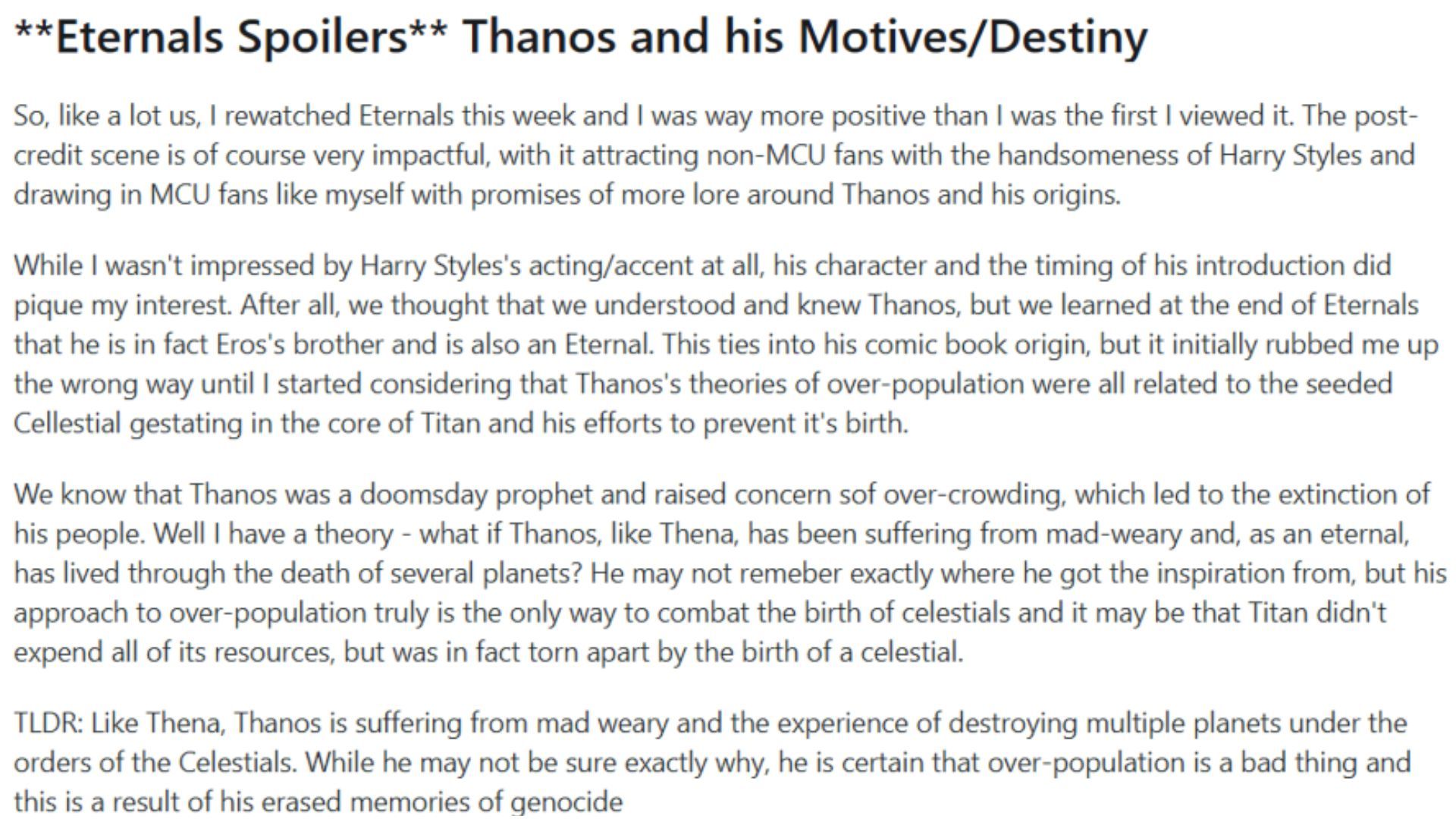 "We know that Thanos was a doomsday prophet and raised concerns of over-crowding, which led to the extinction of his people. Well I have a theory — what if Thanos, like Thena, has been suffering from mad-weary and, as an eternal, has lived through the death of several planets? He may not remeber exactly where he got the inspiration from, but his approach to over-population truly is the only way to combat the birth of celestials and it may be that Titan didn't expend all of its resources, but was in fact torn apart by the birth of a celestial."