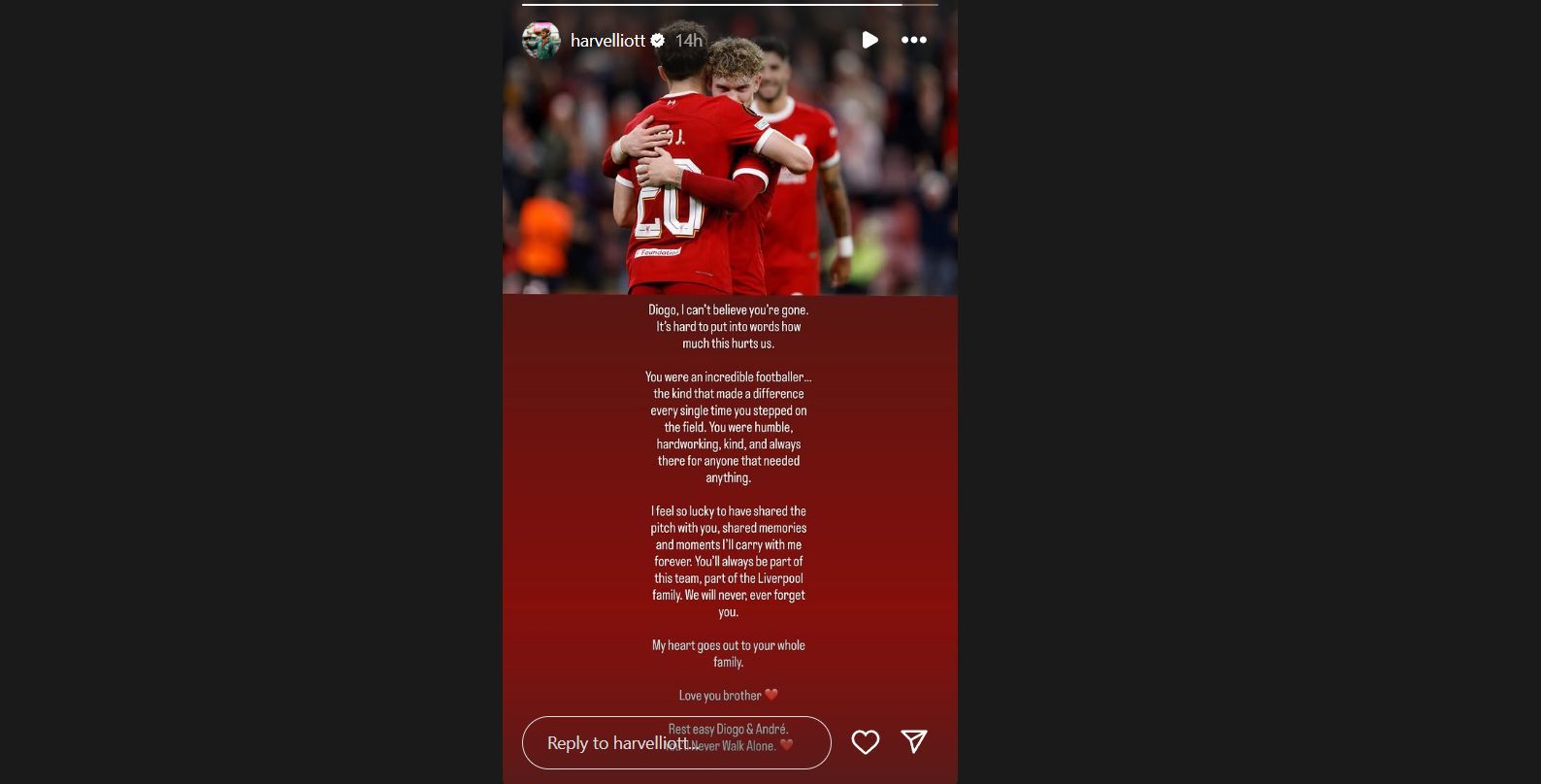 After the news of Jota and his brother's death came out, his teammates came forward to honor him with heartfelt tributes. The Liverpool star, Andy Robertson, paid a lengthy tribute to Diogo on his Instagram post. Andy and Jota were teammates for five years and had played the Premier League, FA Cup, and League Cup together. In the tribute note, Andy wrote: