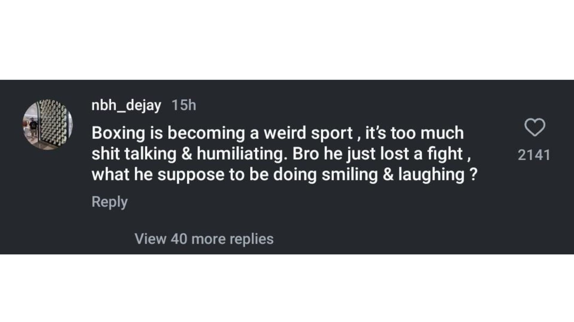 "Boxing is becoming a weird sport, it's too much shut talking & humiliating. Bro he just lost a fight, what he suppose to be doing smiling & laughing?"