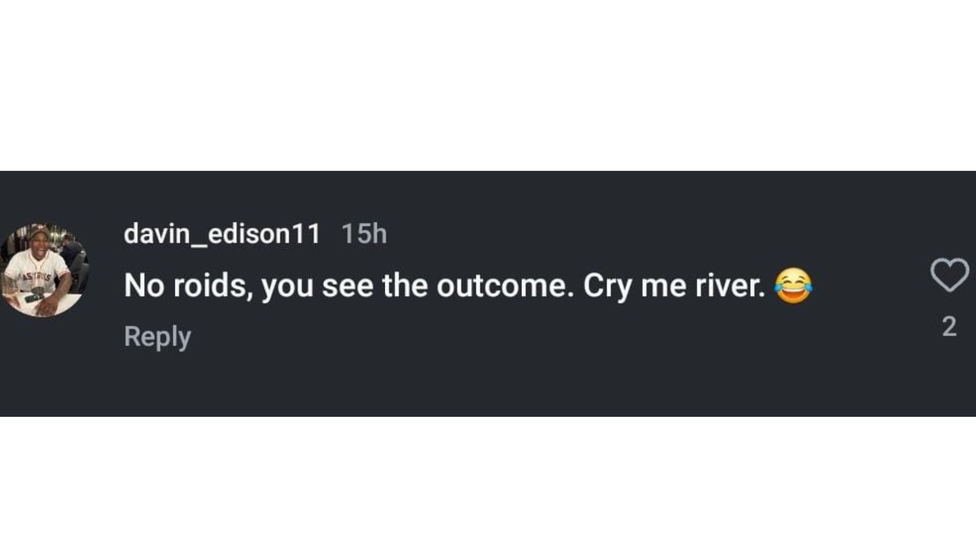 "No roids, you see the outcome. Cry me river😂"