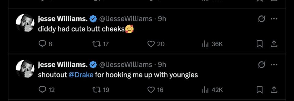 On June 8, 2025, Jesse Williams joined the list of celebrities whose social media account was hacked, with a string of unpleasant, strange, and obscene tweets being posted from his X account . Rapper Drake and troubled music mogul Sean "Diddy" Combs were among the well-known individuals mentioned in the messages, which, in addition to the offensive language, attracted a lot of attention.