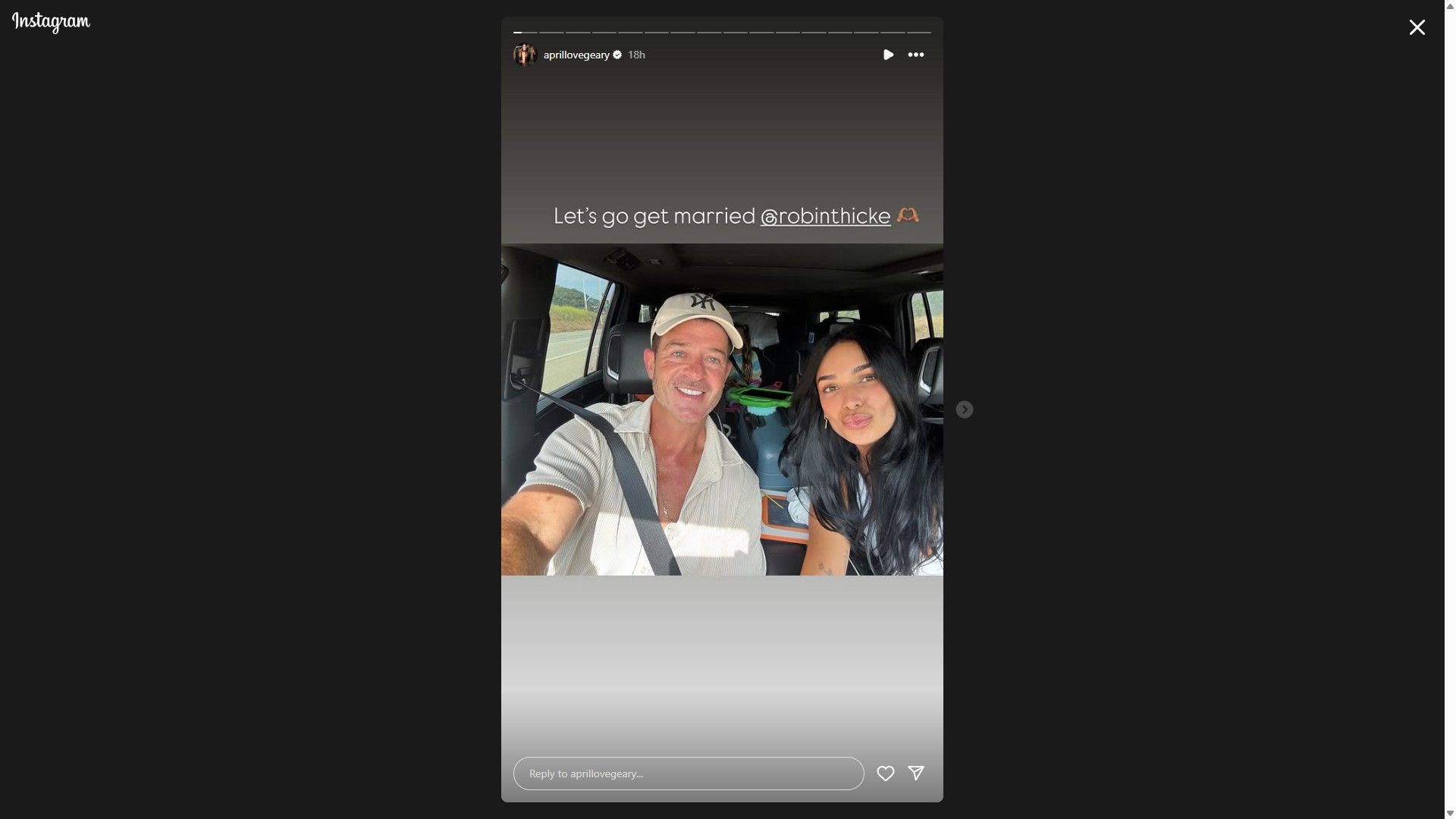On Thursday, May 29, April Love Geary shared a picture with Robin Thicke via her Instagram Stories and wrote, “let’s go get married @robinthicke.” In the following stories, the model shared and reshared pictures and videos from their trip to Mexico, where the pair will marry over the weekend.