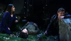 A short time later, Anna felt someone touch her shoulder. She softly called out Duke's name, but it was Andre. Andre helped Anna sit up and quickly wrapped his jacket around her as she asked how he had found her. Andre promised to fill her in later as he helped her to her feet and ushered her out the door.