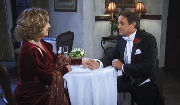 After Lulu left, Kevin's gaze filled with admiration as he told Laura that she looked breathtaking. Laura smiled lovingly at him, prompting him to suggest that they start their evening with a glass of Champagne. He held out a chair as Laura sat down at the table in front the fireplace with a cozy crackling fire. After he poured chilled Champagne into two flutes, he handed one to Laura then sat down and toasted to "us." Laura smiled, so Kevin confessed that he was nervous. Laura chuckled because she was nervous too.