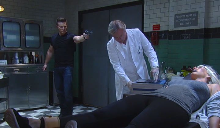 Dr. Lasaris told Carly that continued treatments would give her a "new perspective" as he hooked her up to the electroconvulsive therapy machine. Just then, Jason burst into the room with a gun and ordered the doctor and nurse on the floor. He zip tied their hands behind their backs and took off Carly's restraints. "Are you real?" she asked. "I'm here," he assured her, and he grabbed her hand. He helped her off the table and to the door, but the doctor didn't think they would make it to the exit. Jason and Carly quickly but carefully ran through the halls of Ferncliff.