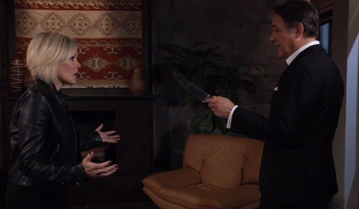 Ryan held up a large knife and talked about missing Ava, who realized it was Ryan. She declared that she had been waiting for that moment and walked toward him. Ryan backed away. "Not so fast, my darling," he warned. Ava laughed awkwardly. She stated that she had missed Ryan, and she wanted him to put the knife down.
