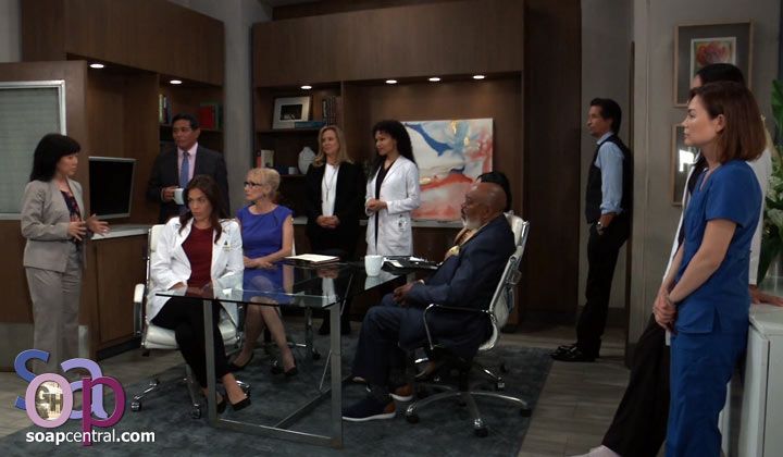 Monica continued that she'd already reversed some of Cyrus' questionable decisions, like reinstating Bobbie and Epiphany to their previous positions, effective immediately. She dismissed everyone back to work, and most of the attendees filed out, congratulating Monica on their way. Finn was glad to have her back, as he'd missed her. Monica admitted that she'd missed him, too, and she allowed him to go tend to Chase.