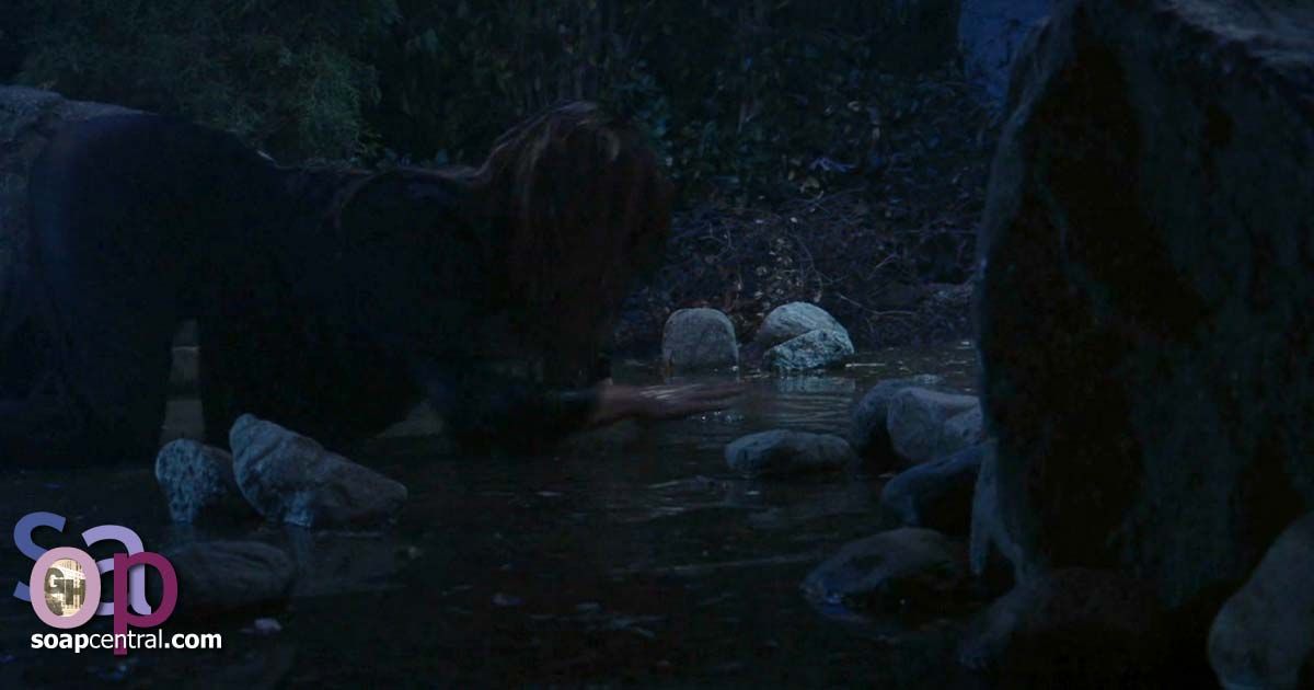Meanwhile, a weak and bedraggled woman in dark clothing slowly crawled out of the water. Moments later, she collapsed on the rocky shore.