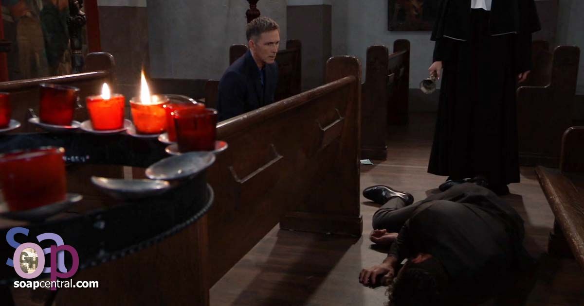 Just then, Kevin appeared, disguised as a priest. Kevin helped Valentin hide the bodies of Victor's men. Valentin wondered how many of Victor's people were watching Charlotte. Laura told Valentin about a rear entrance to the building, and Valentin thanked Laura and Kevin for their help. The three headed out of the chapel to find Charlotte.