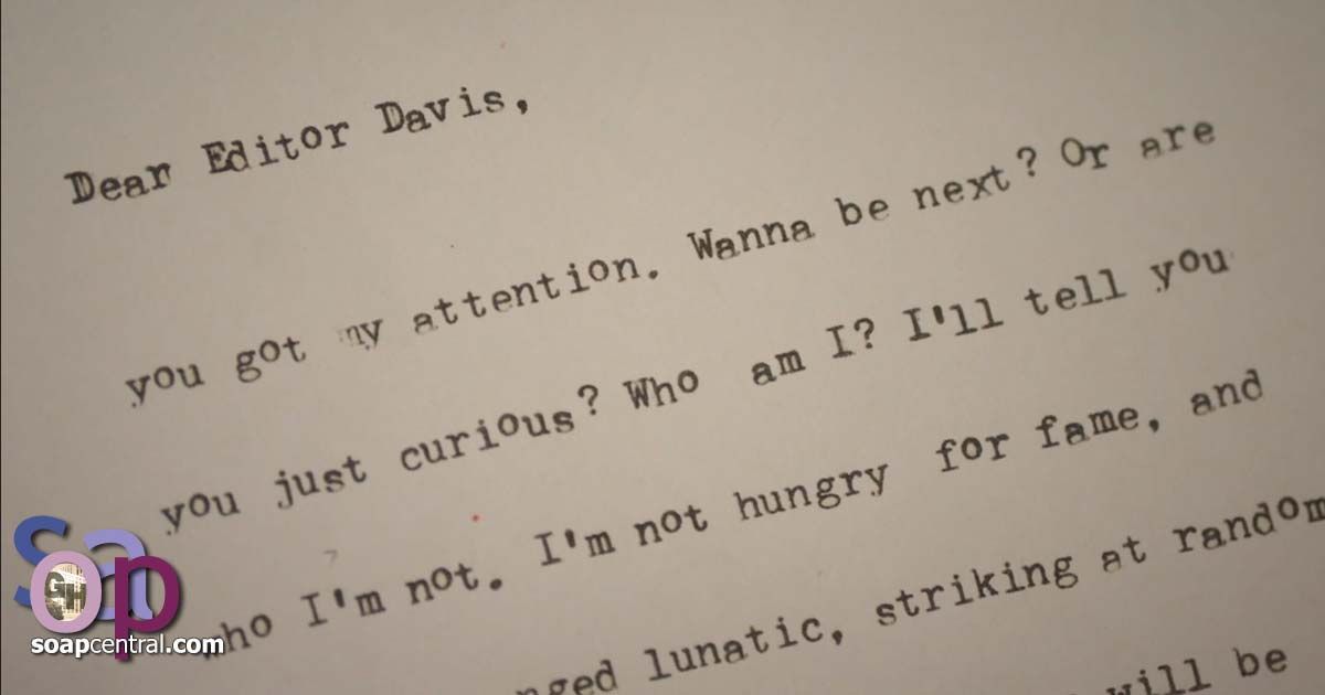 A short time later, Jordan and Dante entered Alexis' office. Alexis pointed to her desk as she explained that she had touched the note before she had realized its importance. Dante slipped on a pair of gloves and collected the evidence. He picked up the letter and read it to Jordan. "Dear Editor Davis, you got my attention. Wanna be next? Or are you just curious? Who am I? I'll tell you who I'm not. I'm not hungry for fame, and I'm no deranged lunatic striking at random. Only those who wronged me and mine will meet with my venom," Dante read aloud.