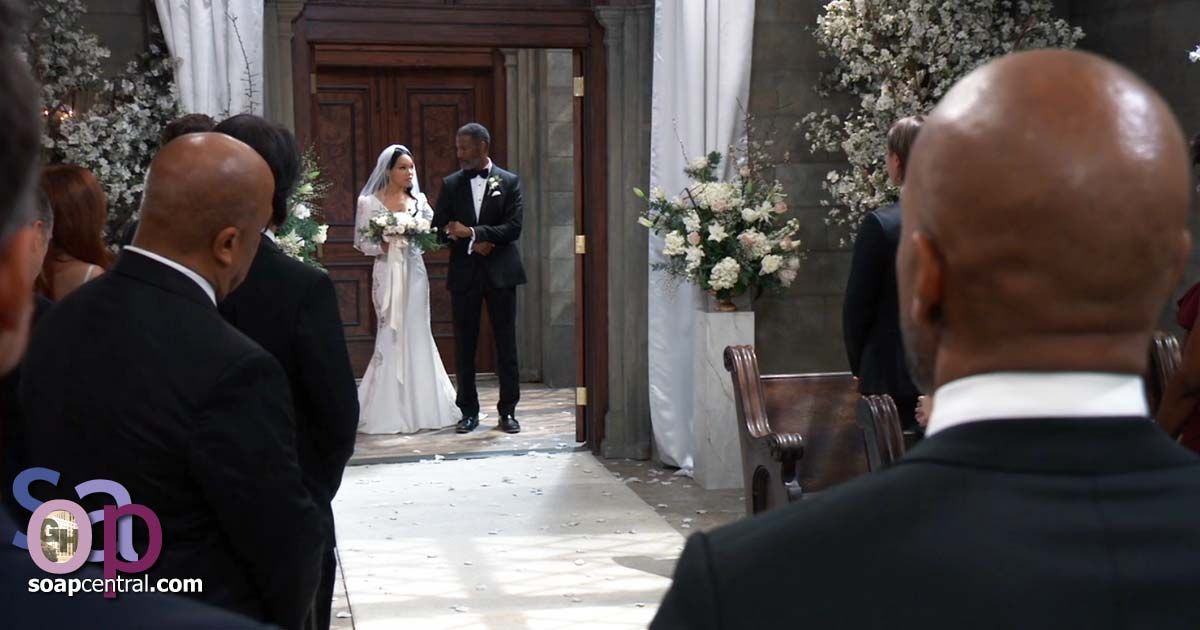 Trina walked down the aisle as everyone stood. The "Bridal Chorus" started to play, and Sterling walked Portia down the aisle as everyone looked on and smiled. Portia was escorted to Curtis, who took her hands in his.