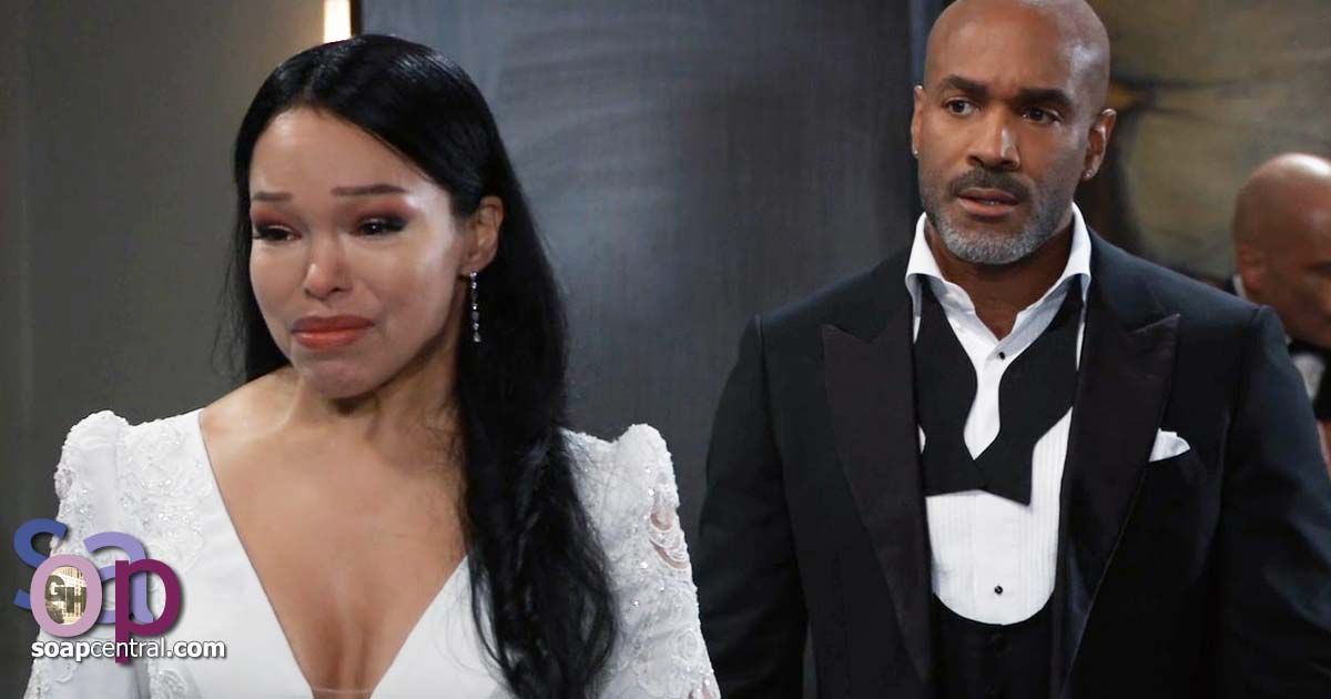 Meanwhile, Portia tossed her bouquet. It went sailing over the heads of the ladies gathered on the dance floor and landed at Trina's feet. Portia was happy to see her daughter. "Trina, we've been trying to find you," Portia said. "And I've been trying to find answers," Trina replied.