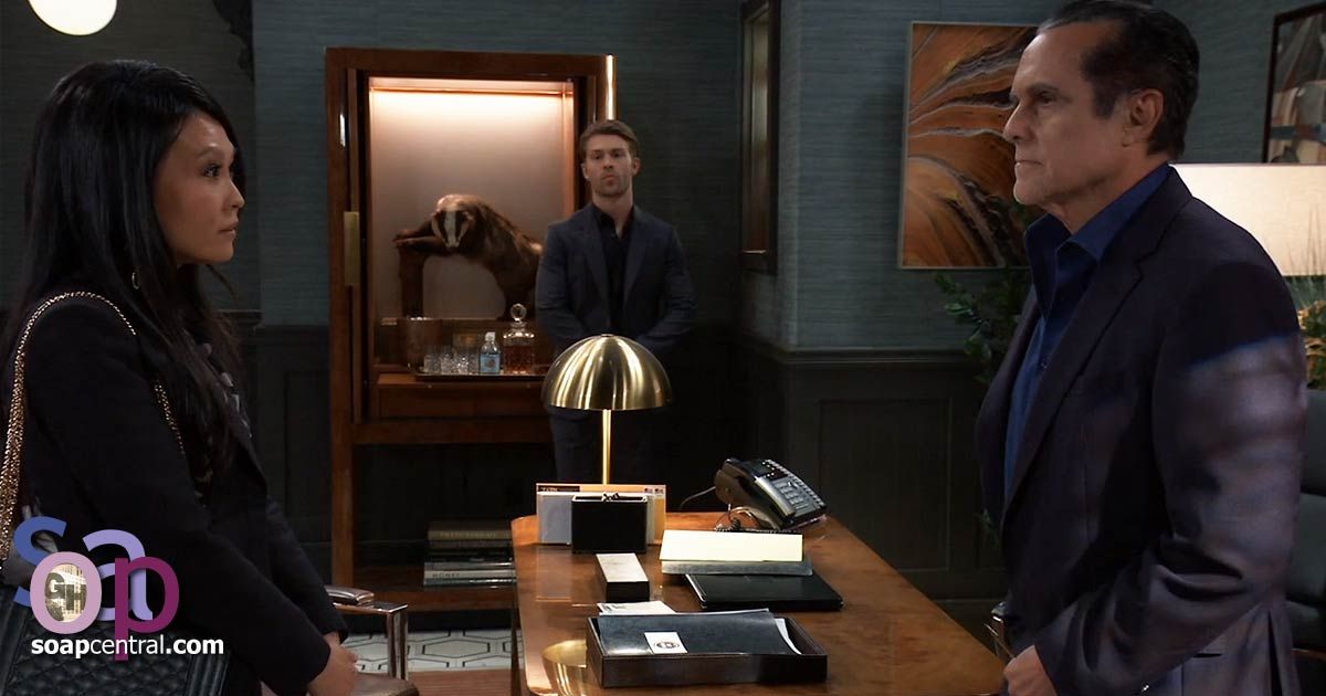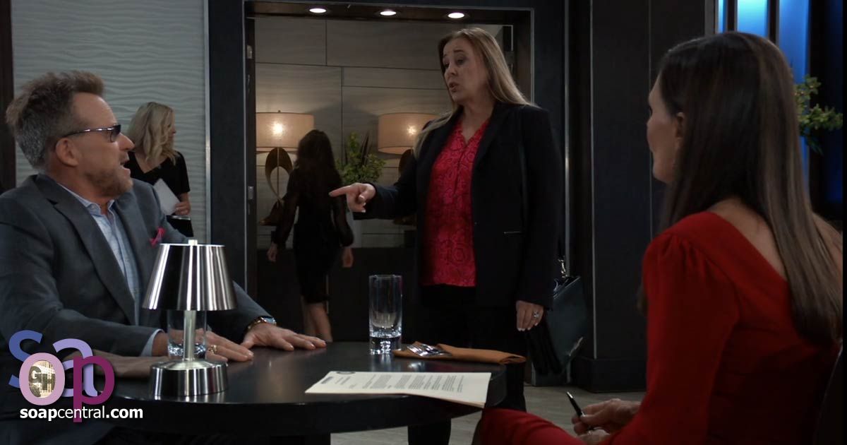 Selina mentioned that Gladys had sold her Brando's garage at a bargain price. "I'm surprised. Didn't it ever occur to you to inform me, your ally in this situation? If I was the suspicious type, I would think that maybe you were trying to get information or leverage on me. And if that were the case, you and I would have a big problem," Sonny said threateningly.
