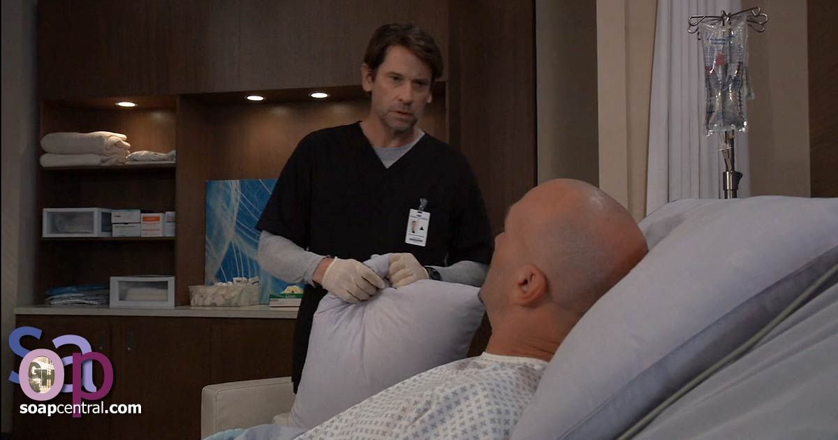 Austin noted that Mason would never help him. "Not on your life," Mason said angrily. "Well, then, I guess it's just time. It's time for me to help myself," Austin said with resignation. Austin proceeded to turn off the hospital monitor next to Mason's bed. Austin then grabbed a pillow from a chair nearby, and he approached Mason. "You don't have the guts," Mason said.