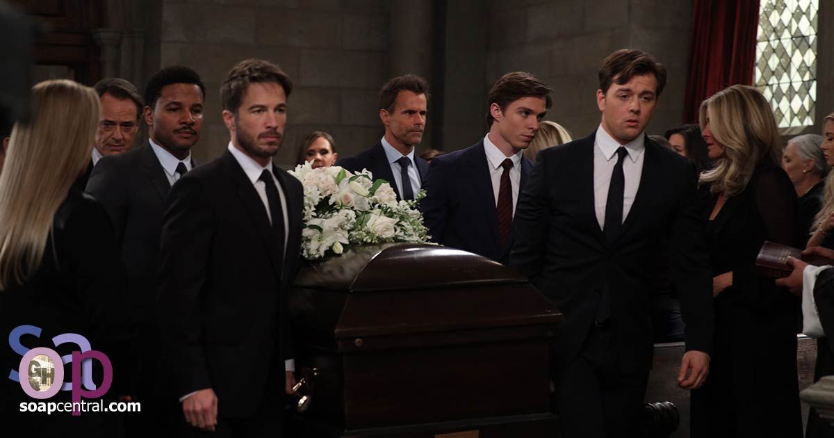 Moments later, everyone stood as Bobbie's casket was carried to the front of the church by Lucas, Michael, Felix, Spencer, Kevin, and Drew. Carly's eyes filled with fresh tears as she watched. After the priest opened with a prayer, Laura stood to speak. Laura admitted that she and Bobbie had been more than sisters-in-law; they'd been friends. Laura recalled Bobbie always leading with her heart, being unfailingly positive, and having a knack for seeing the good in everyone.