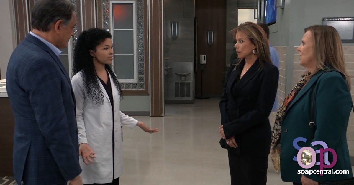 At the hospital, Tracy spotted Gregory seated on a bench near the nurses' station. After she greeted him, he revealed that he had an appointment with Dr. Kramer. Tracy admitted that she was there for blood work and an annual wellness check with Dr. Randolph. Moments later, Elizabeth walked up to fetch Gregory.