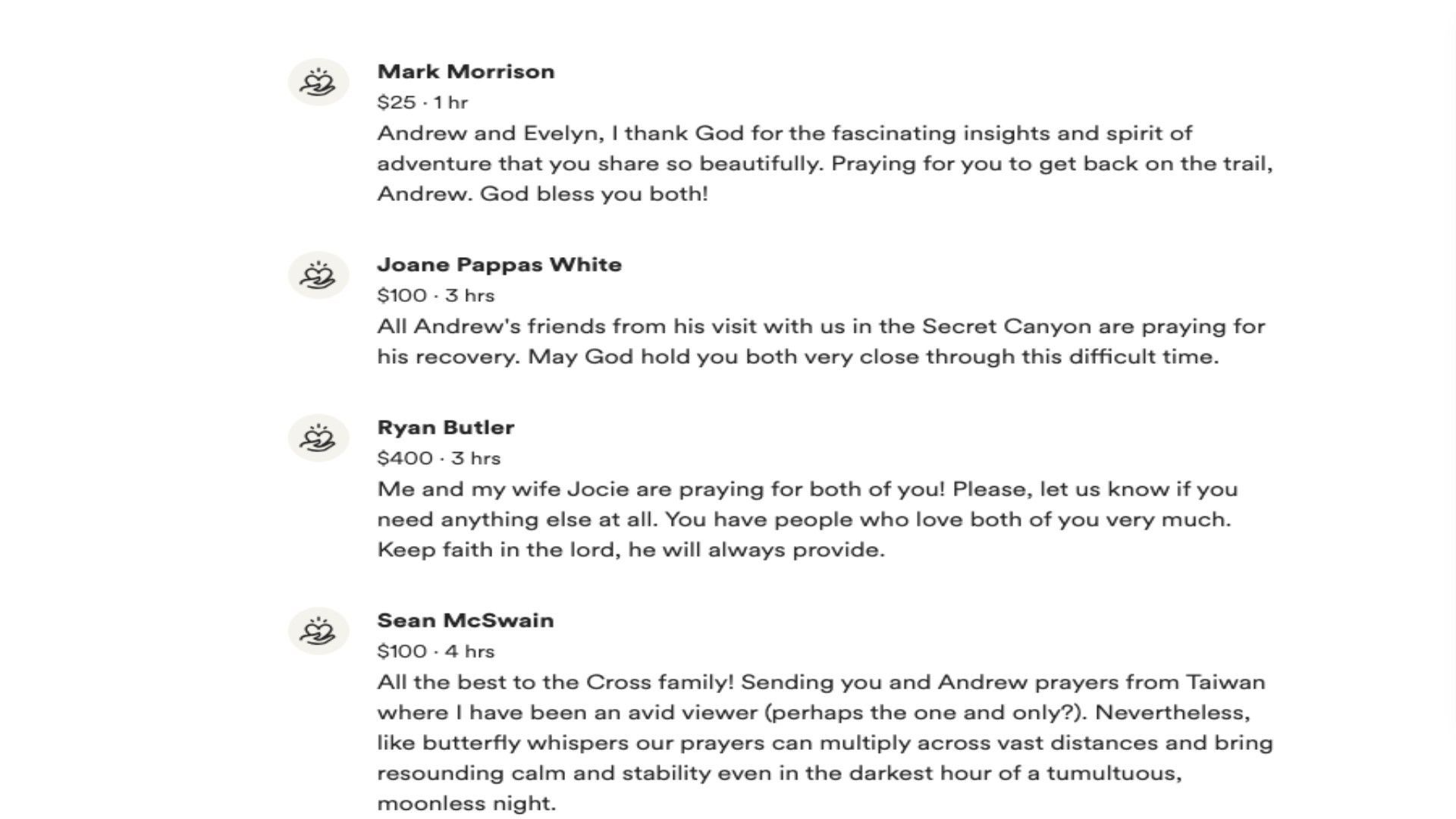 “Andrew and Evelyn, I thank God for the fascinating insights and spirit of adventure that you share so beautifully. Praying for you to get back on the trail, Andrew. God bless you both!”