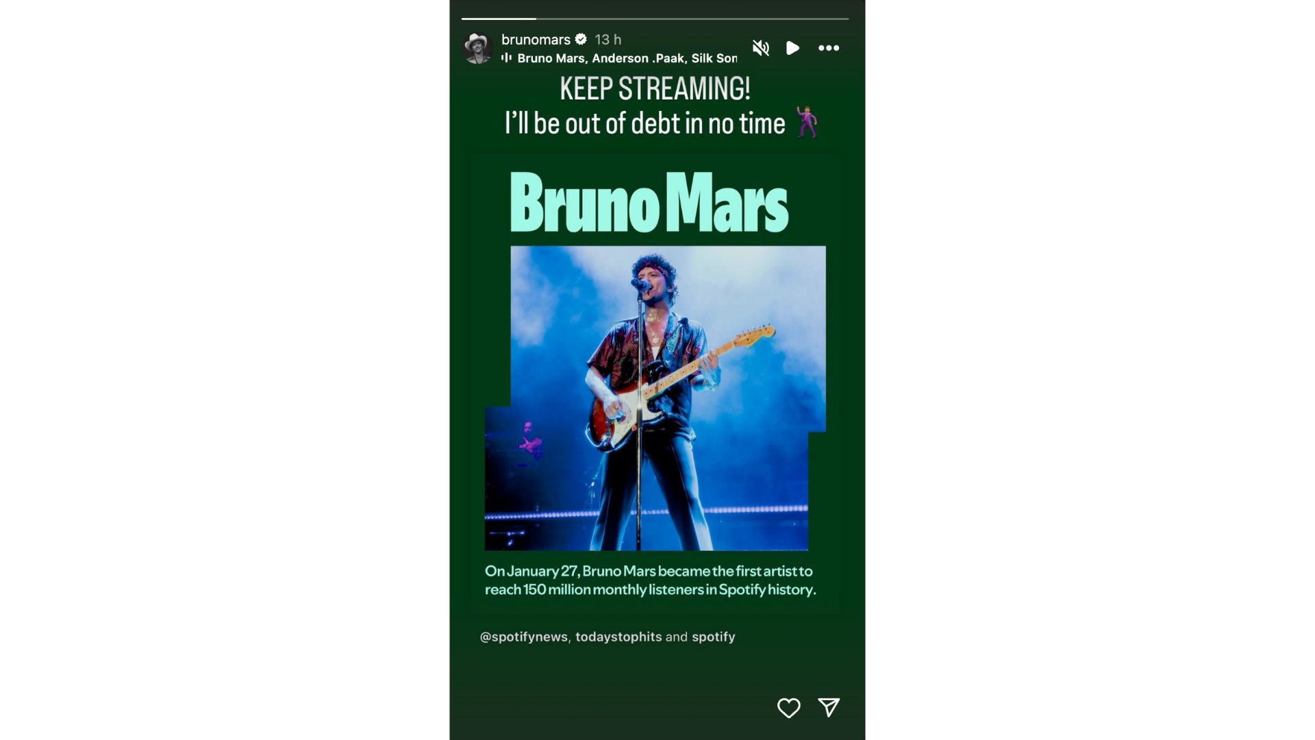 Taking to his Instagram handle, Bruno Mars reposted Spotify’s post on his story, writing: