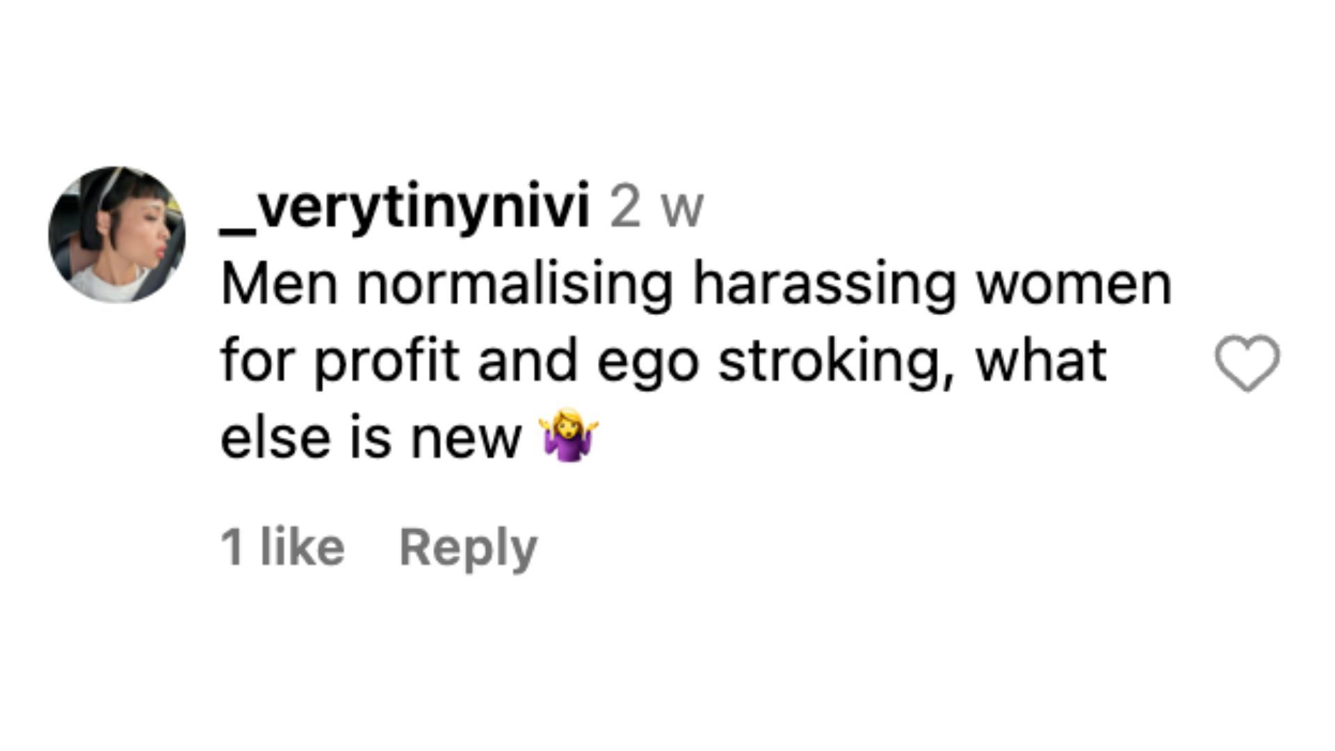 "Men normalising harassing women for profit and ego stroking, what else is new 🤷‍♀️"