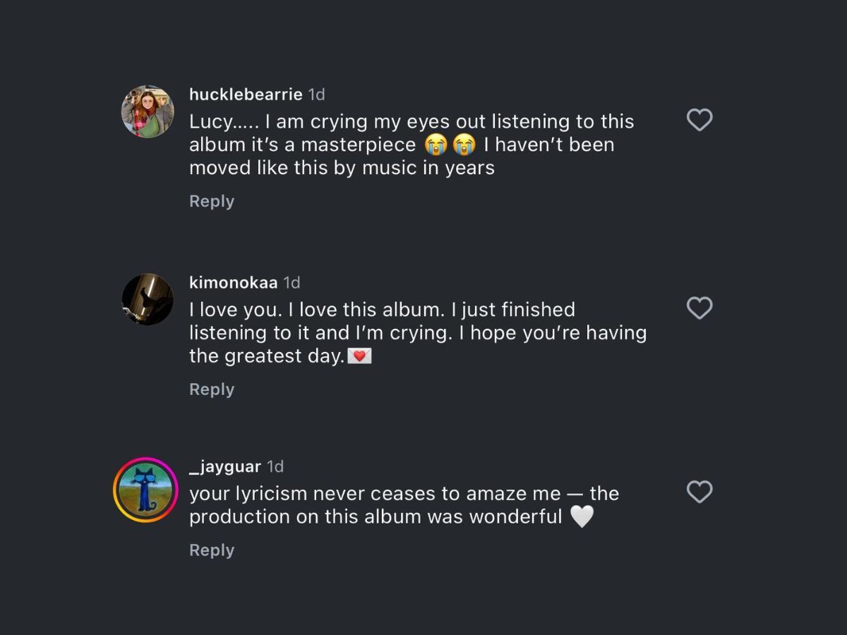 “This album is absolutely phenomenal. Thank u so much for such an intimate heartfelt masterpiece; I feel so blessed to be of witness to it u are one of a kind Lucy. Happy release day to the most glorious religious experience I've ever heard,” @blueberryscoop3 commented.