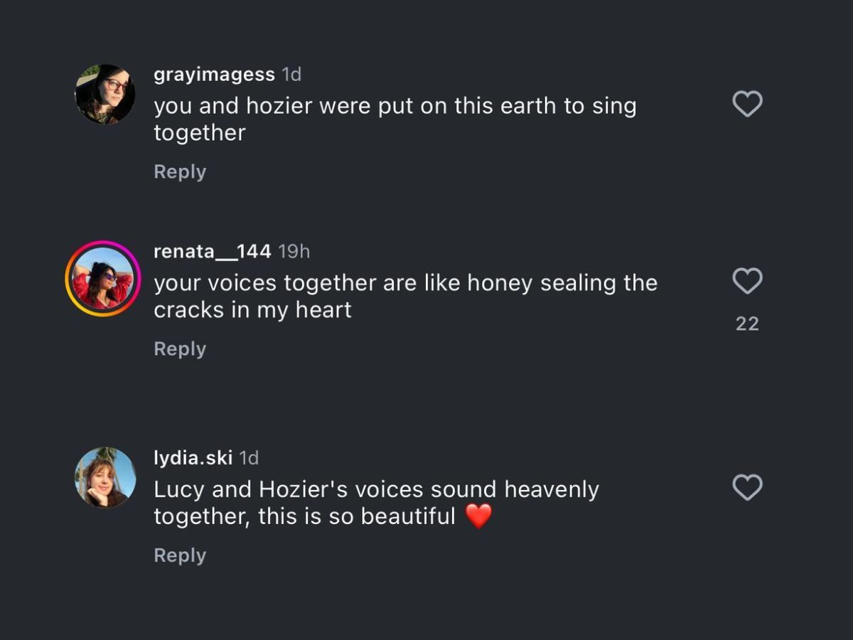 “Lucy and Hozier's voices sound heavenly together, this is so beautiful,” @lydia.ski added.