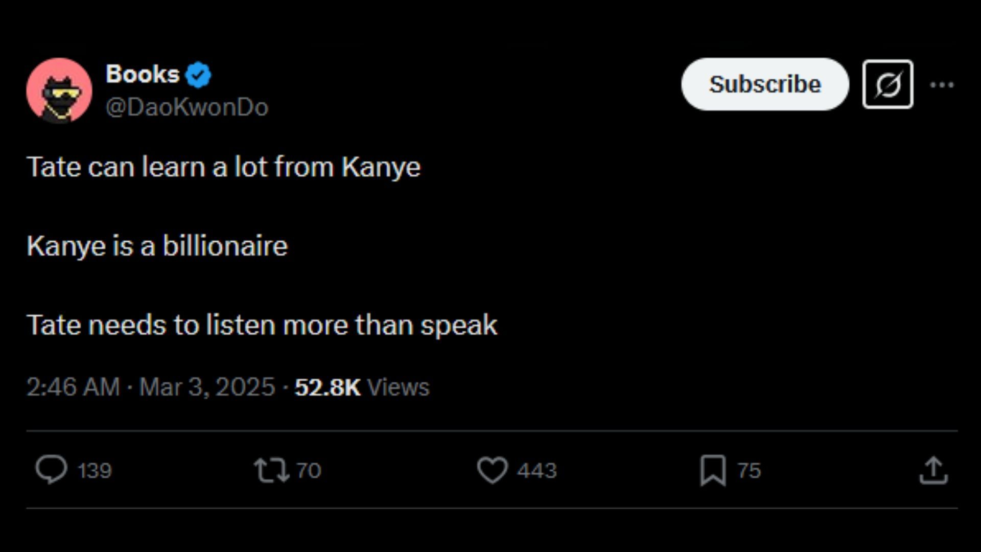 One comment read: "Tate can learn a lot from Kanye Kanye is a billionaire Tate needs to listen more than speak"
