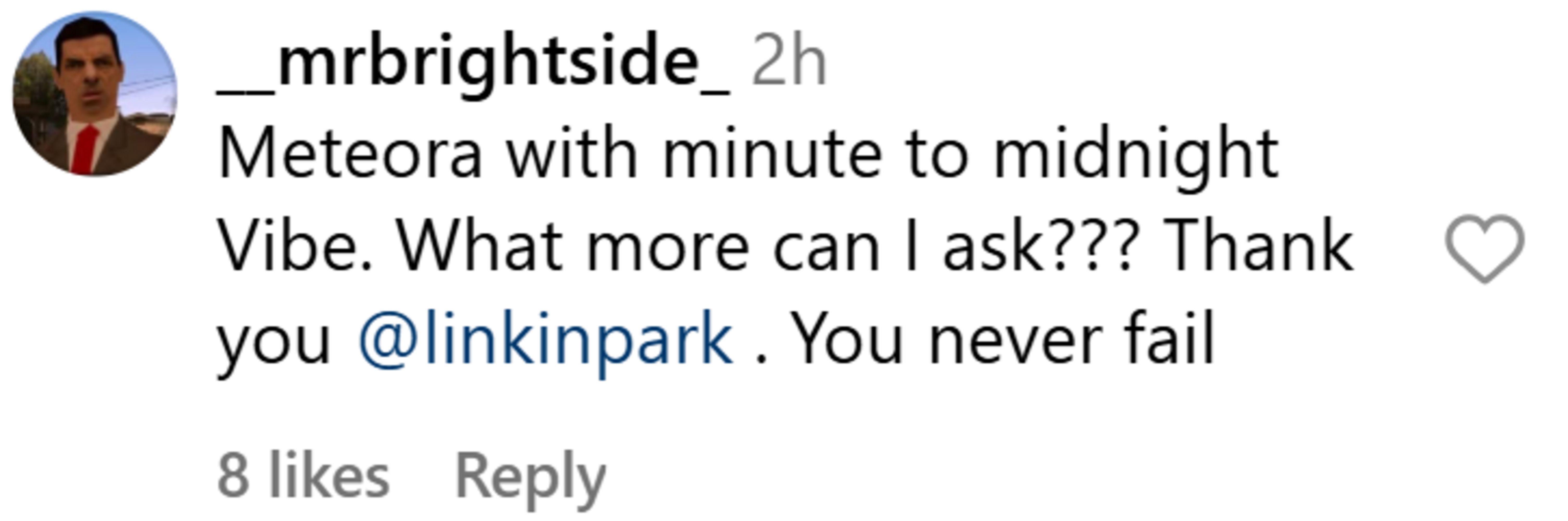 "Meteora with minute to midnight Vibe. What more can I ask??? Thank you @linkinpark . You never fail," another user, @__mrbrightside_, wrote.