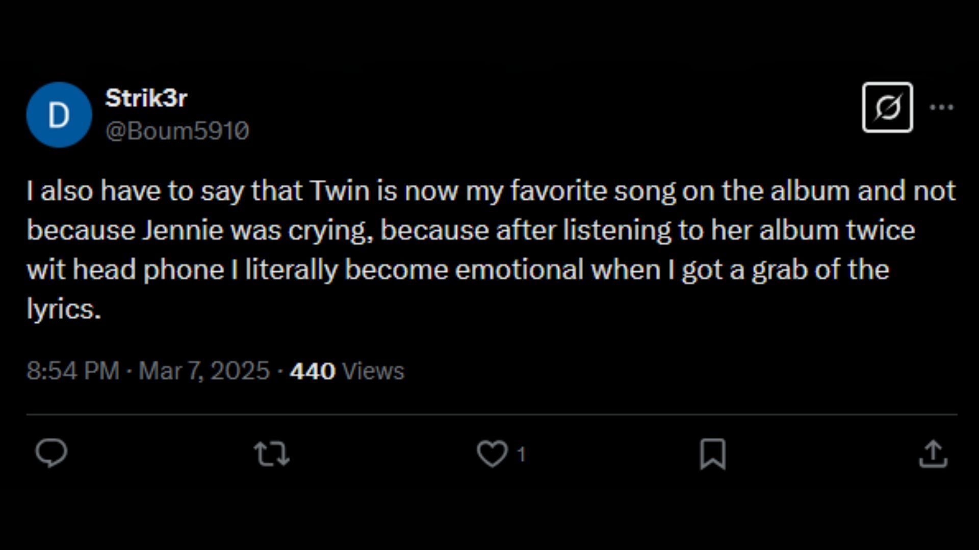 One fan spoke about feeling the song a lot: "I cried whole night listening to twin n now jennie is making me cry more"