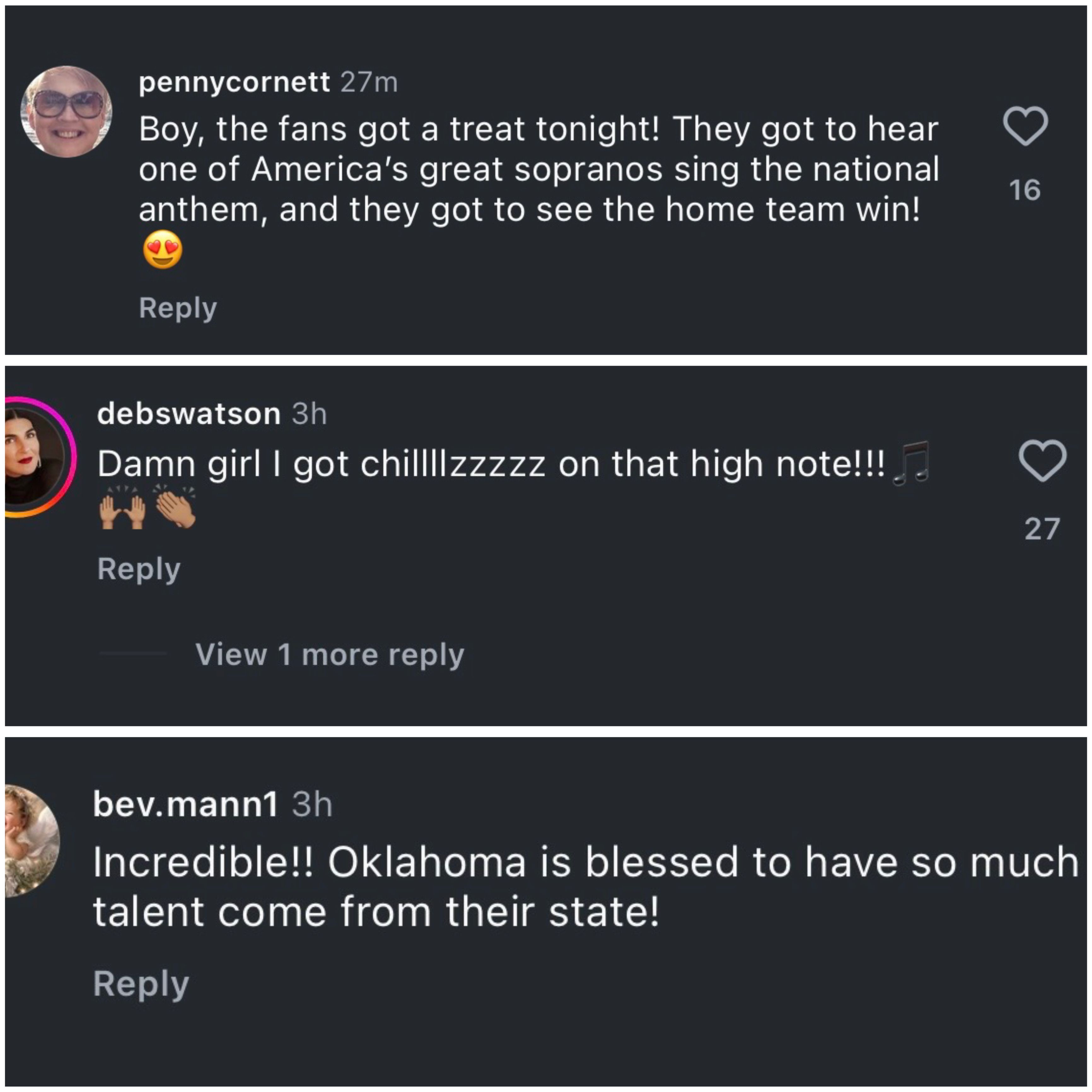 “Boy, the fans got a treat tonight! They got to hear one of America's great sopranos sing the national anthem, and they got to see the home team win!” @pennycornett commented.