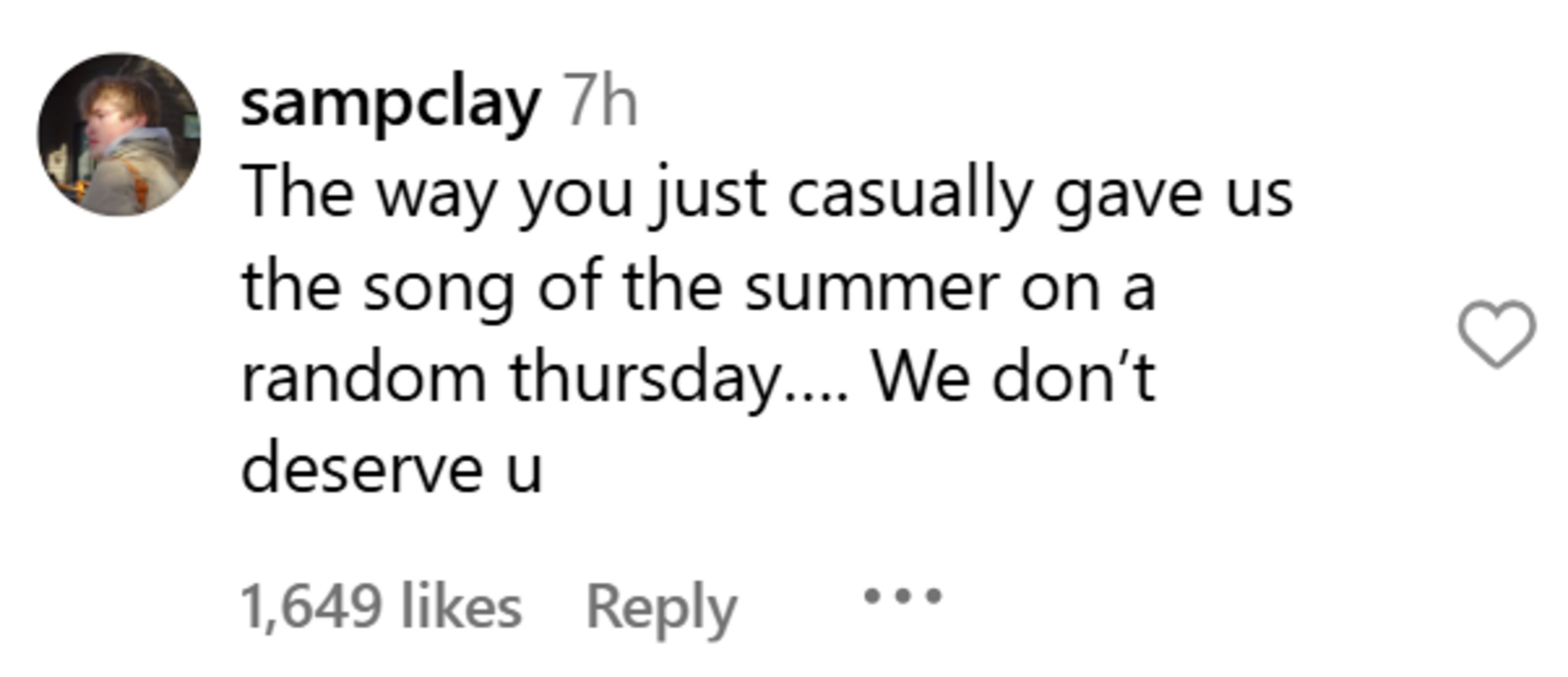 "The way you just casually gave us the song of the summer on a random thursday…. We don’t deserve u," a user, @sampclay, commented.