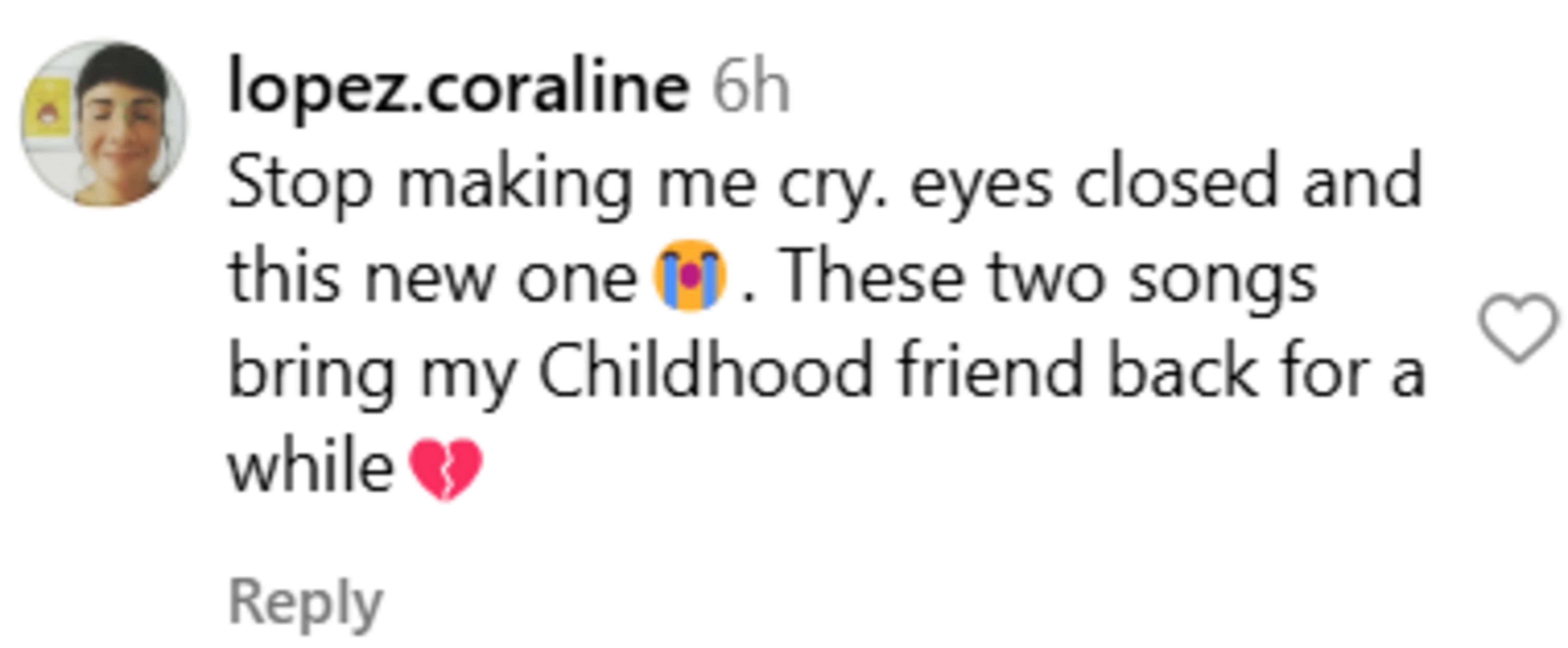 "Stop making me cry. eyes closed and this new one😭. These two songs bring my Childhood friend back for a while💔," a user, @lopez.coraline, commented.