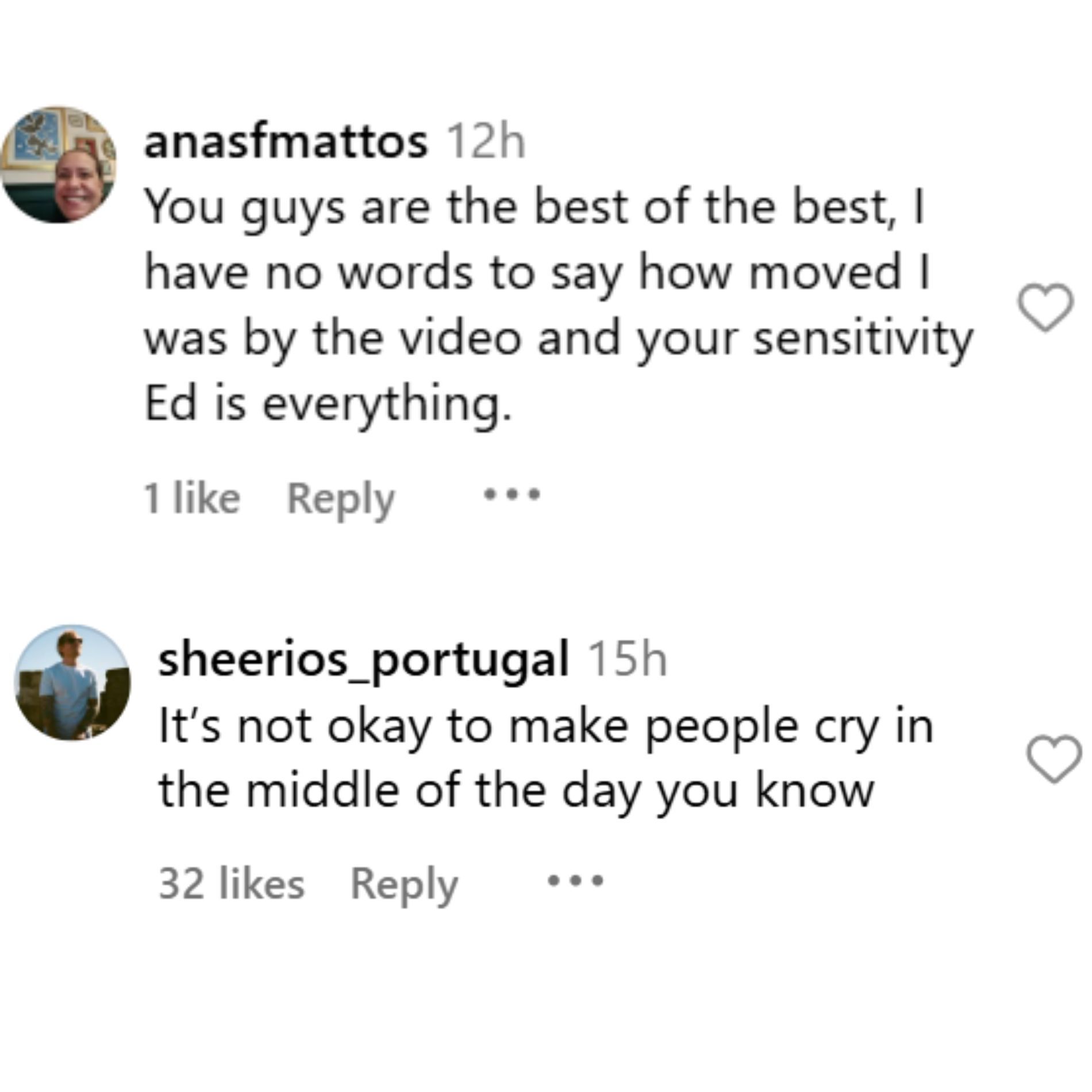 "You guys are the best of the best, I have no words to say how moved I was by the video and your sensitivity Ed is everything." another user, @anasfmattos, added.